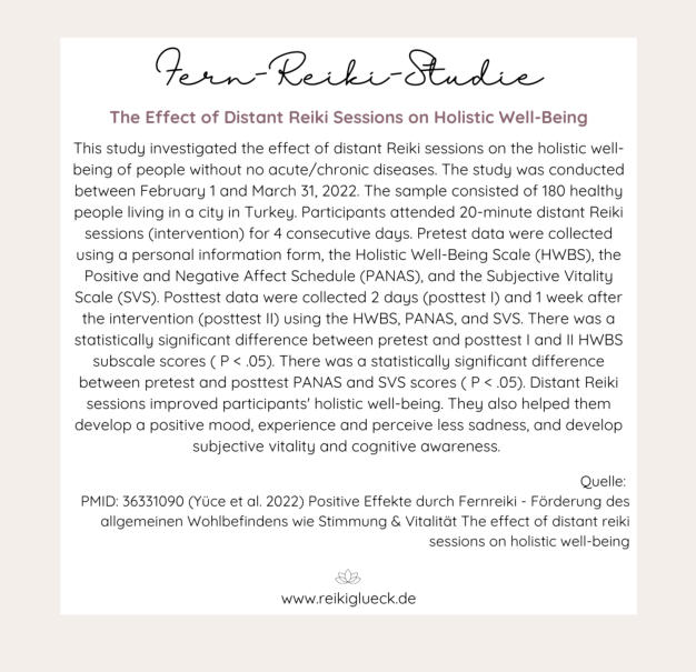 Fern-Reiki-Sitzungen verbesserten signifikant das ganzheitliche Wohlbefinden der Teilnehmer. Sie