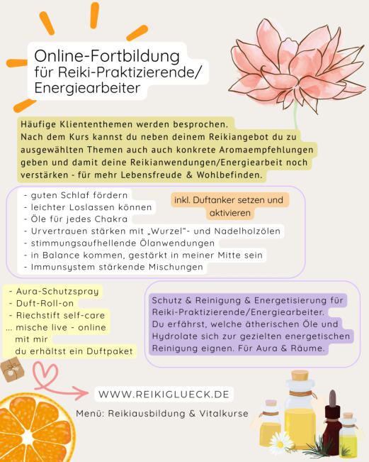 Der Onlinekurs Reiki/Energiearbeit & ätherische Öle findet 2 x jährlich in kleinen Gruppen statt. Nach der