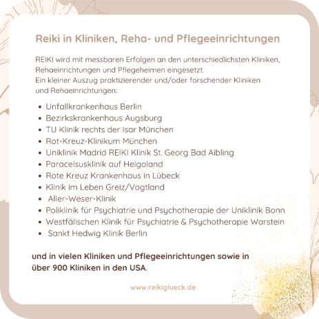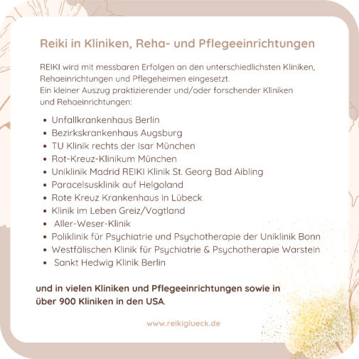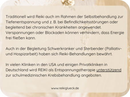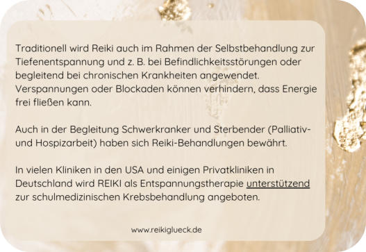 Die energetischen Reikibehandlungen dienen der Aktivierung der Selbstheilungskräfte und werden nicht therapeutisch eingesetzt.